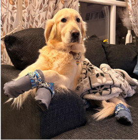 Hunden min sliter i perioder hvor potene blir såre og noen gang sprekker. Fokus på potepleie er derfor kjempeviktig! Etter smøring av potene bruker vi å ha spasokkene på en god stund. De holder på fukten og lindrer de såre potene hennes. Sokkene sitter kjempefint på og med antiskli under så synes hun heller ikke det er ubehagelig å gå rundt på gulvet. Dette er et av de beste kjøpene vi har gjort av potesokker!