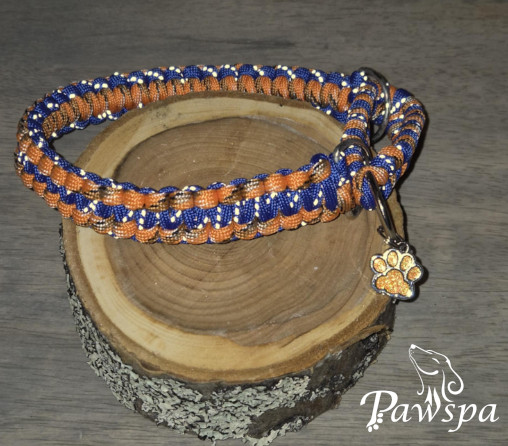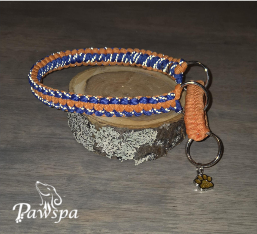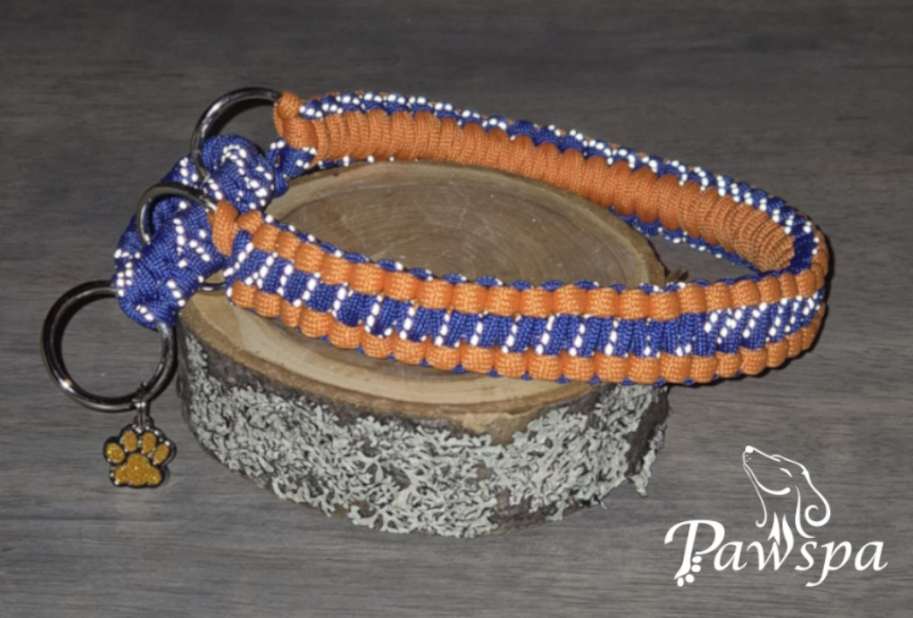 Halsbånd med refleks 29 cm. orangespettet og blå.