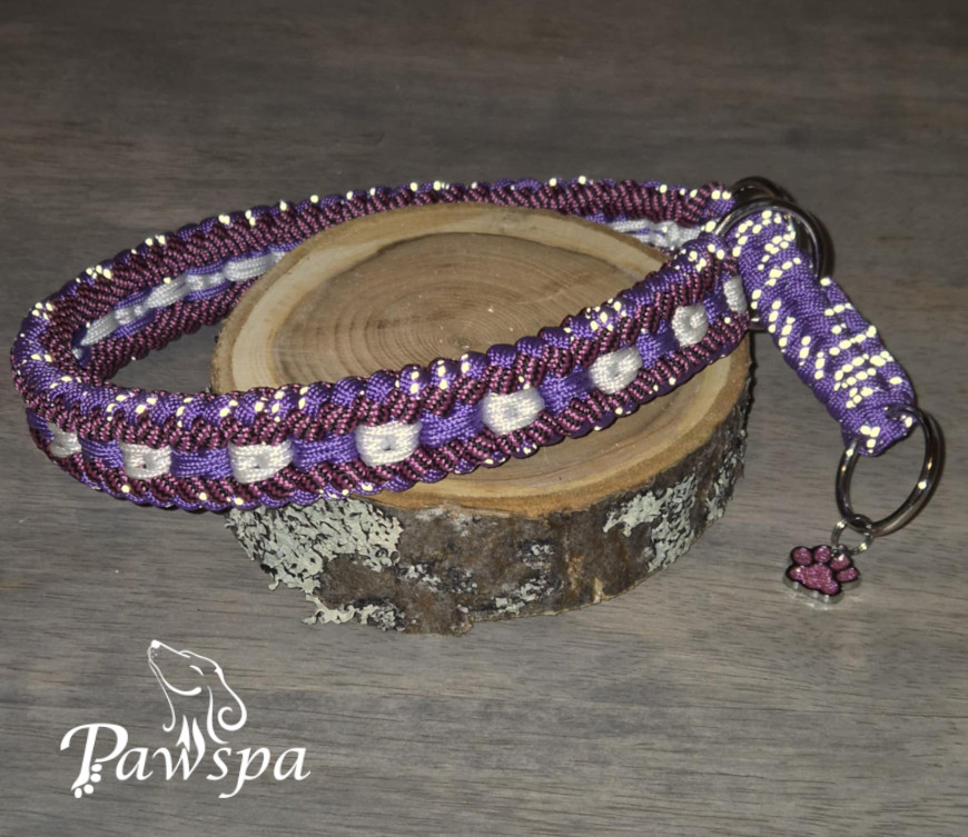 Halsbånd med refleks 42 cm. Lilla, vinrød/mønstret og hvit.