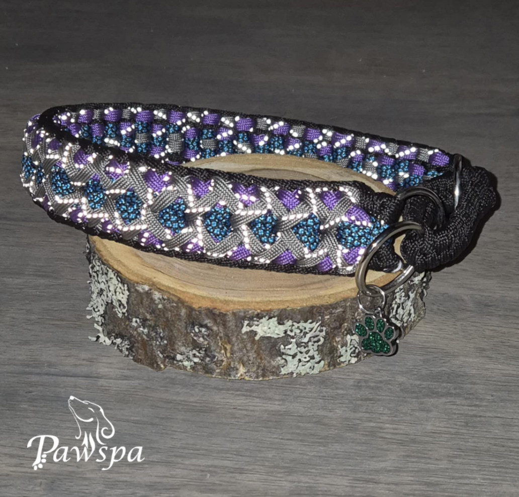 Halsbånd med refleks 40 cm. Sort, lilla, turkis/mønstret og grå.